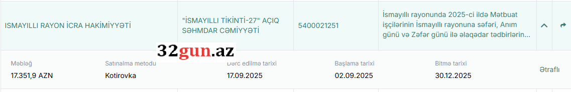 İsmayıllı Rayon İcra Hakimiyyəti 2025-ci ildə Mətbuat işçilərinin səfəri, Anım günü və Zəfər günü ilə əlaqədar tədbirlərin keçirilməsi üçün “İsmayıllı Tikinti-27” Açıq Səhmdar Cəmiyyəti ilə 17 min 351,9 manatlıq müqavilə imzalayıb.