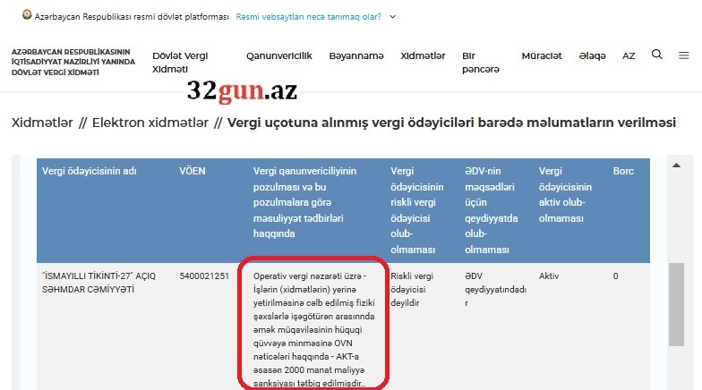 32gun.az-ın əldə etdiyi digər məlumata görə, “İsmayıllı Tikinti-27” ASC bir müddət öncə Operativ vergi nəzarətinin yoxlamaları nəticəsində işçilərlə əmək müqavilələrinin rəsmiləşdirilməsində pozuntuya yol verdiyinə görə 2000 manat maliyyə sanksiyası ilə üzləşib.