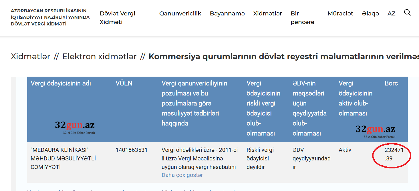 32gun.az xəbər verir ki, klinikanın dövlət qarşısındakı borcu 232471,89 (iki yüz otuz iki min dörd yüz yetmiş bir manat, səksən doqquz qəpik) AZN təşkil edir.